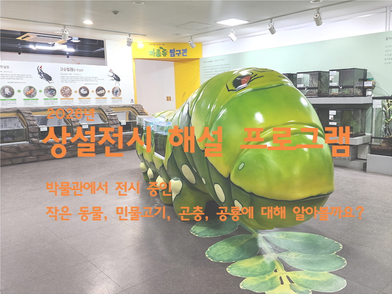 박물관 <상설전시 해설 프로그램>은 박물관을 방문한 단체 관람객을 대상으로 진행되며, 상설전시 중인 작은 동물, 민물고기, 곤충, 공룡을 전시해설과 함께 관람하면서 전시에 대한 이해를 돕는 프로그램입니다.